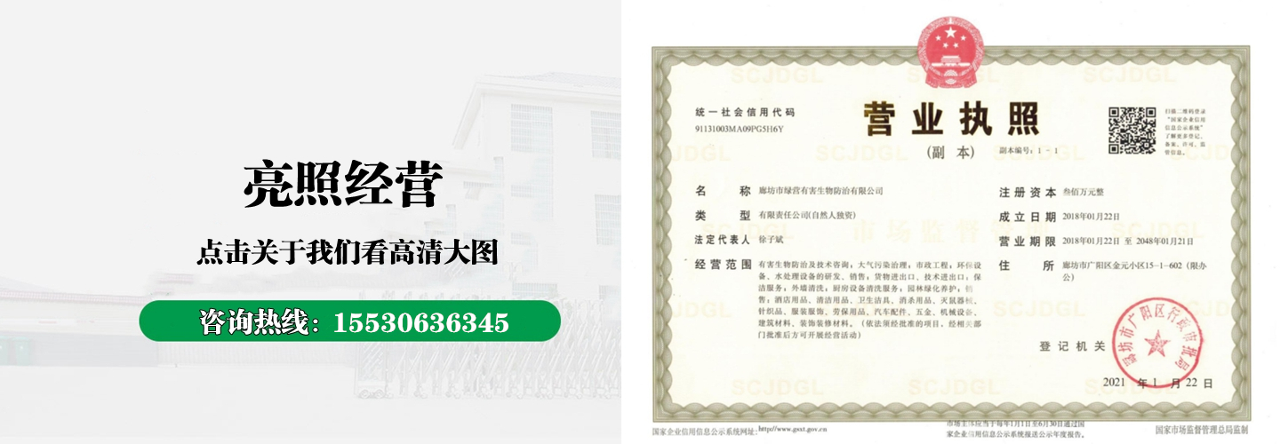 廊坊市綠營(yíng)有害生物防治有限公司主要從事有害生物防治及環(huán)境消毒服務(wù),專注于白蟻預(yù)防工程、滅白蟻、滅老鼠、滅蟑螂、滅蚊蠅、滅跳蚤、滅臭蟲(chóng)、滅紅火蟻、滅塵螨、消毒滅菌、家居清潔等有害生物的預(yù)防和治理服務(wù)。本公司面向,公共場(chǎng)所、商務(wù)樓、商場(chǎng)、超市、公園、工廠、酒店、餐廳、浴場(chǎng)、私人住宅等各類環(huán)境,公司一直堅(jiān)持以健康環(huán)保為前提,讓我們多一份健康”為宗旨,結(jié)合安全、、無(wú)反彈、對(duì)人畜安全無(wú)害,解決您的后顧之憂,與您共同打造一個(gè)無(wú)害、潔凈、舒適、健康的生活環(huán)境。...